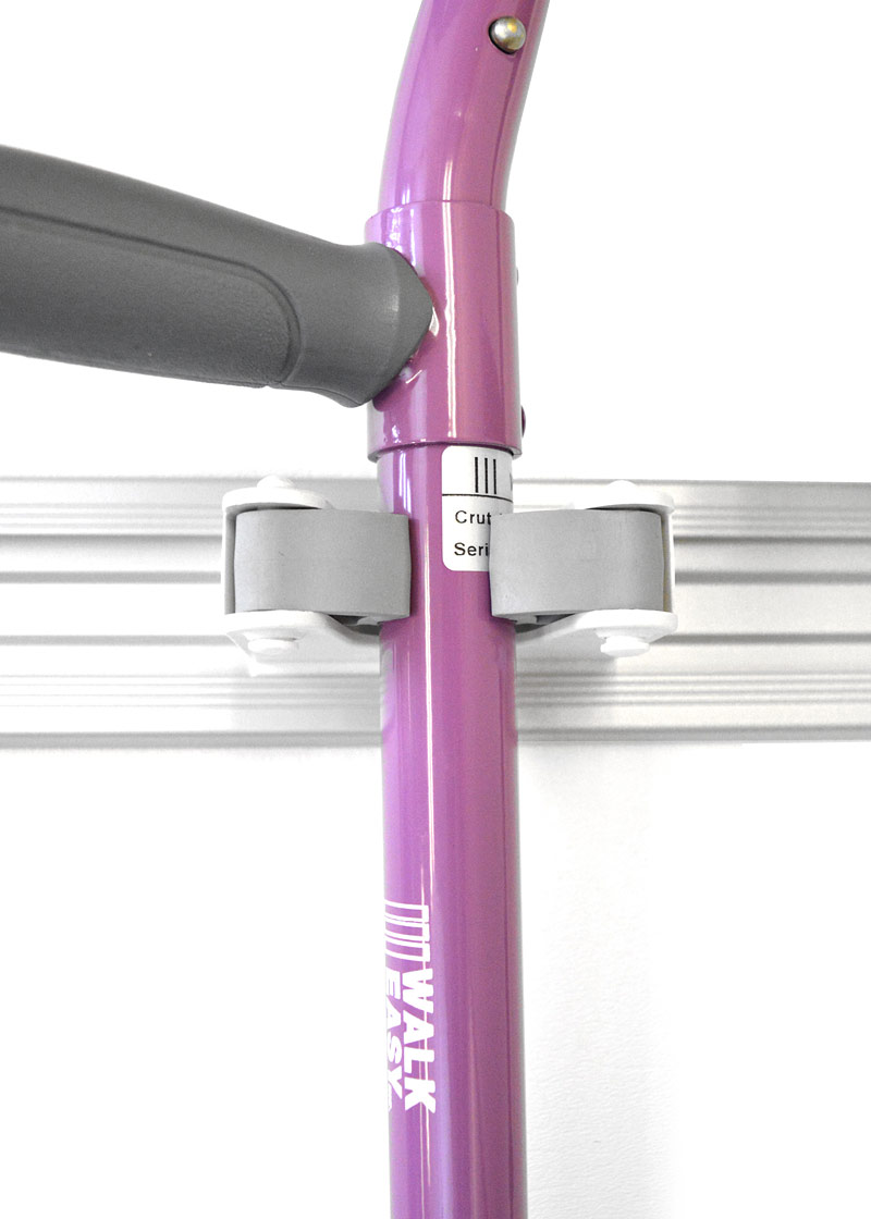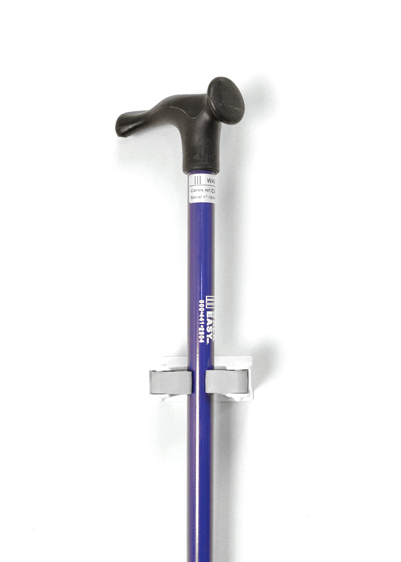 A uniquely designed cane or crutch holder! Mounts to almost any vertical surface (screws included) and holds any tubing from 3/4" to 1 1/8" (20mm. to 30 mm.) diameter. Rubber clasps won't scratch or damage the tube's surface.