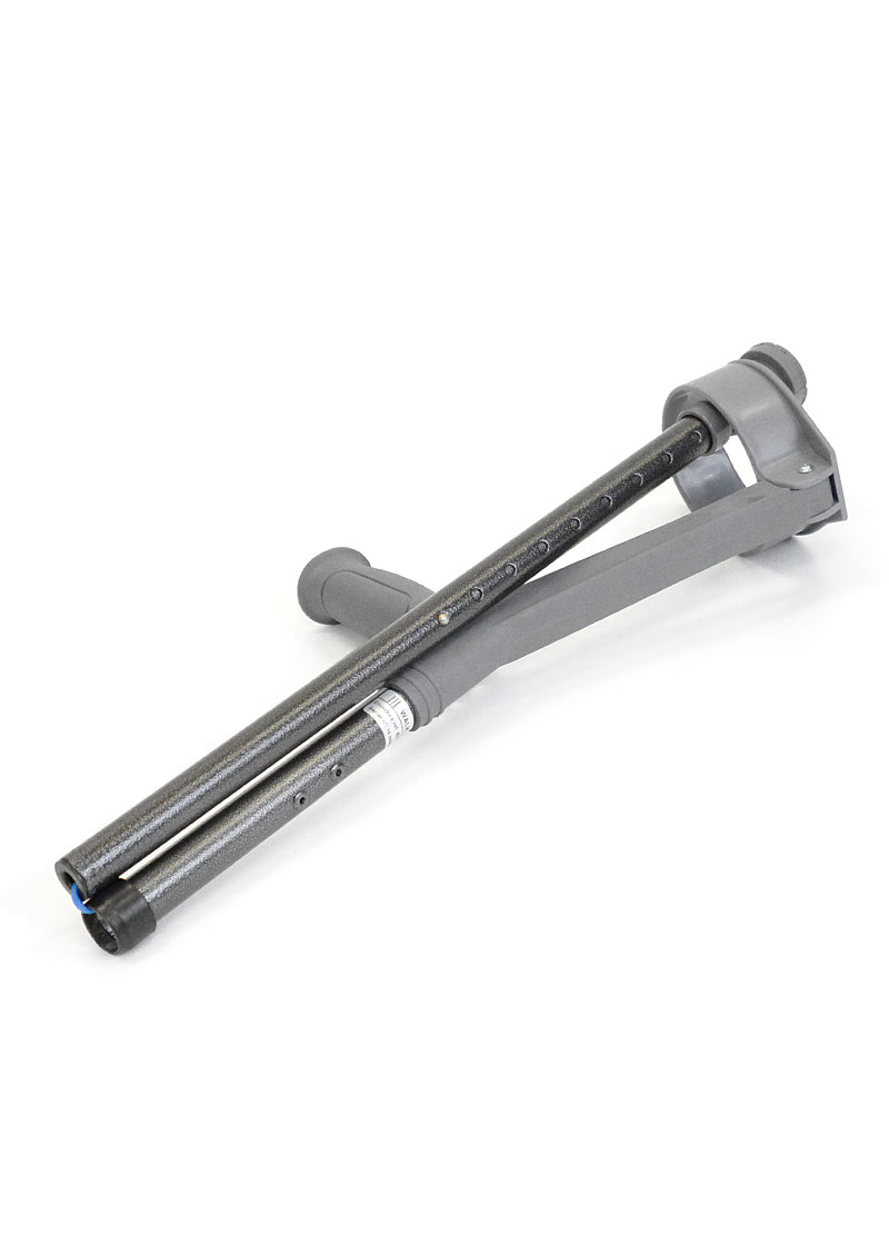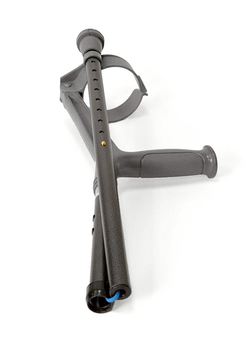 Folding adult forearm crutches with 4" (10 cm.) diameter full cuffs feature a "V-shaped" cuff opening for quick release. Height adjustable grip to floor and the cuffs are fixed height at 8 ¾" above grip (22 cm.). Sold as a pair and fitted with model T10 Pivoflex crutch tips. Available only in granite grey (as shown).