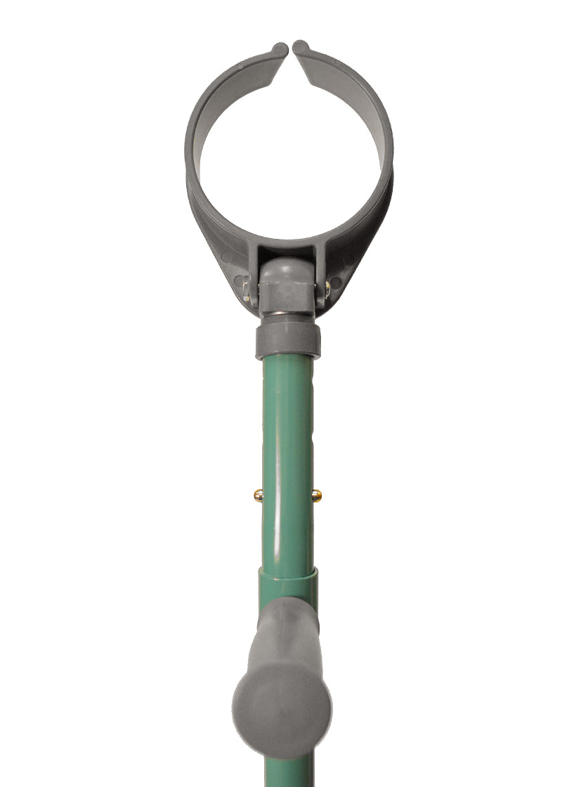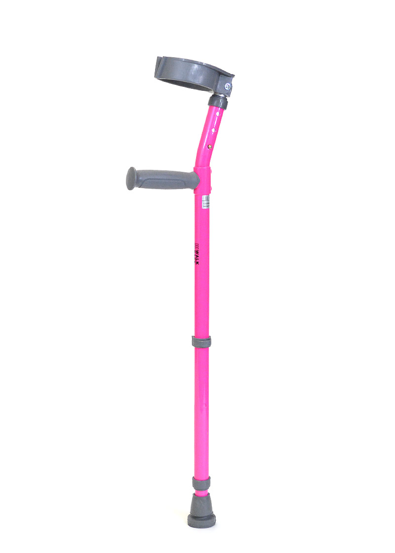 Epoxy-coated youth forearm crutches with 3 1/2" (8.5 cm.) diameter full cuff featuring a V-shaped front opening for quick release. Grip to cuff distance is adjustable with a double push-button and grip to floor height with a Clip. Cuff can be easily replaced or switched out with a half cuff.